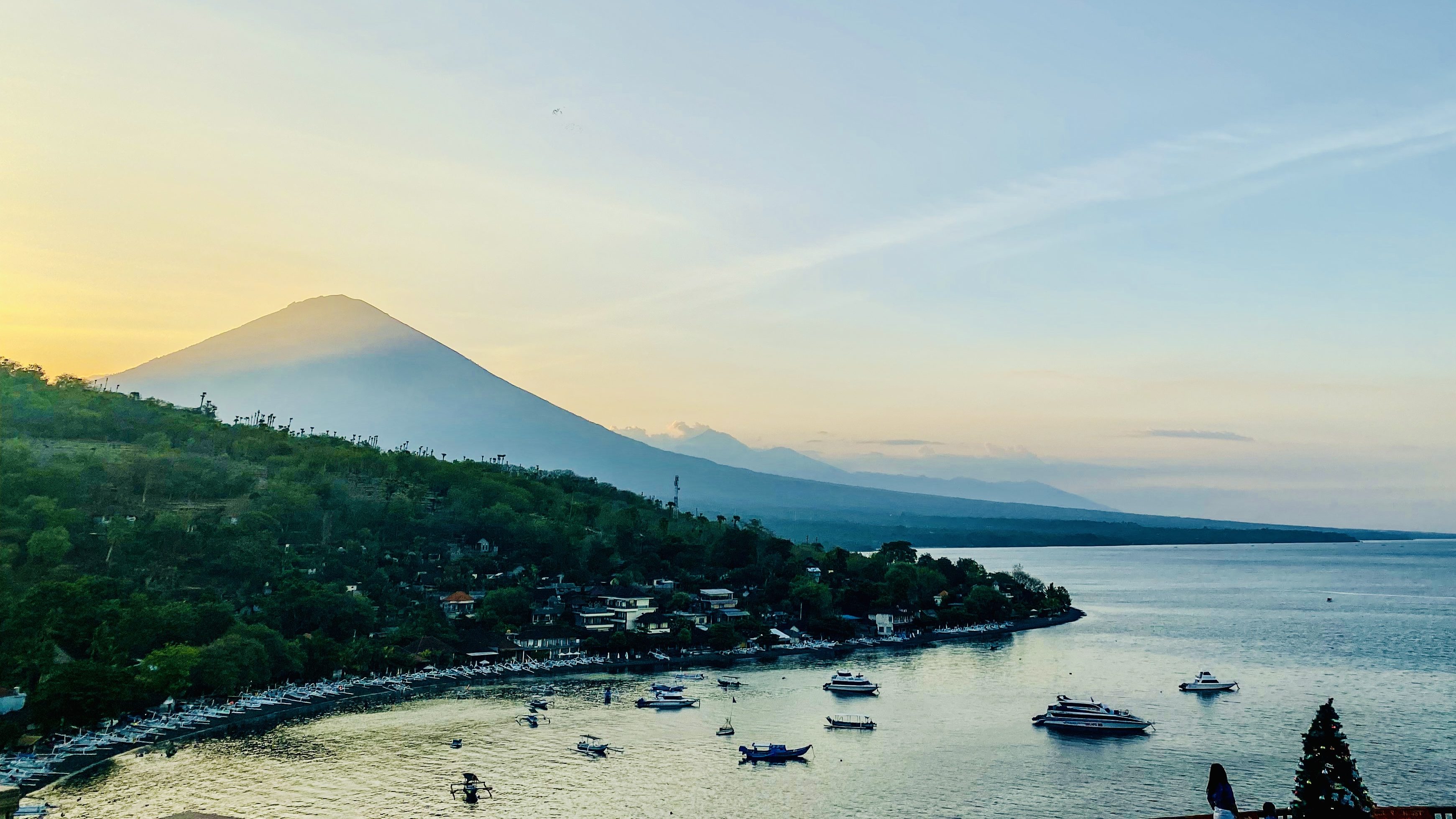 Quelle splendeur de voir le coucher de soleil avec le volcan en arrière-plan. Nous sommes en face d’un des plus jolis paysages de Bali.