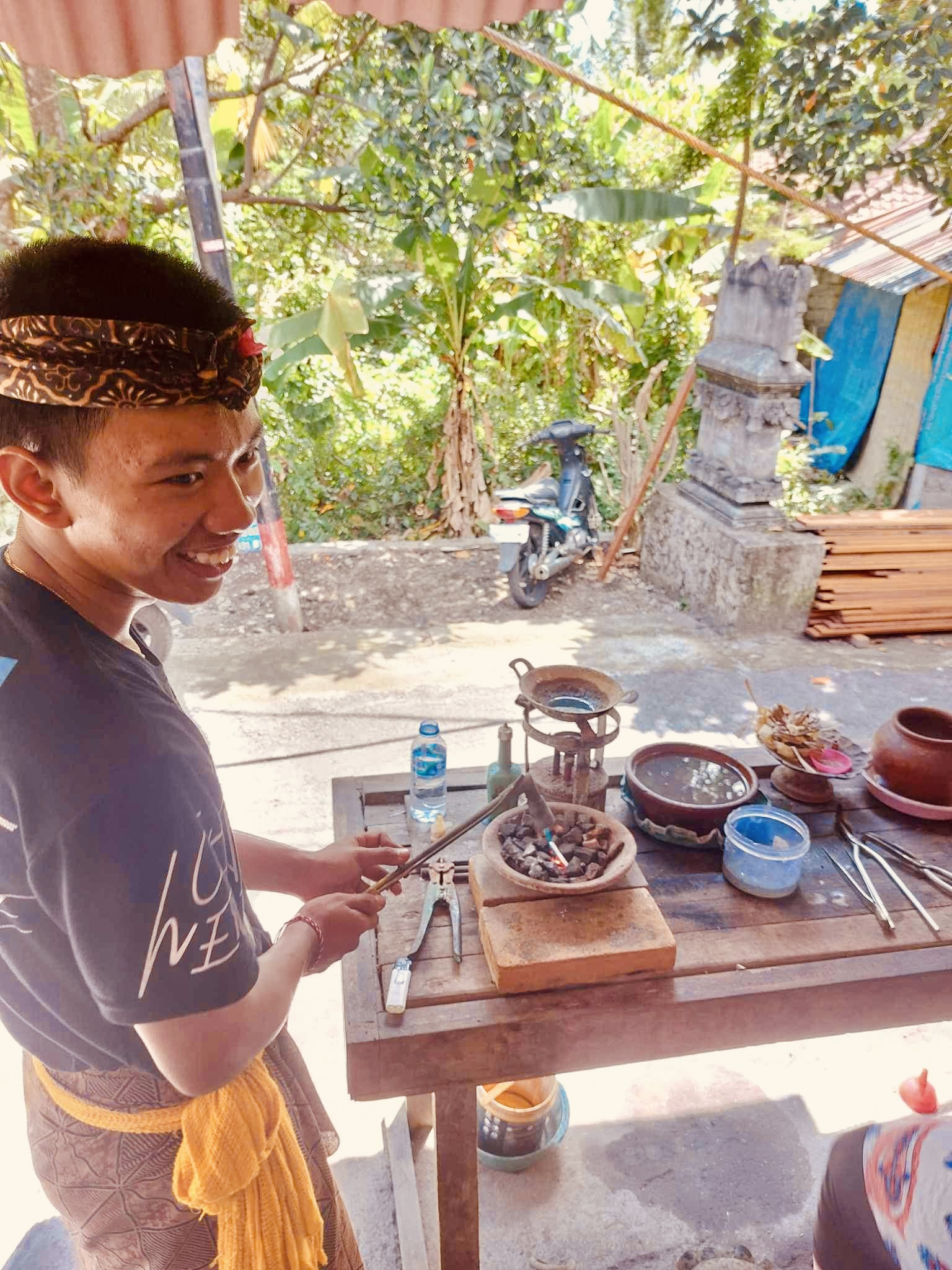Nous continuons notre route et nous tombons vraiment pas hasard sur une petite échoppe avec un couple de Balinais et leur fils, notre curiosité est attirée par une pancarte « Silver ». Nous ne mettons pas longtemps à nous rendre compte que c’est un endroit où nous pouvons fabriquer notre propre bijou en argent pour 300 K IDR (18€).