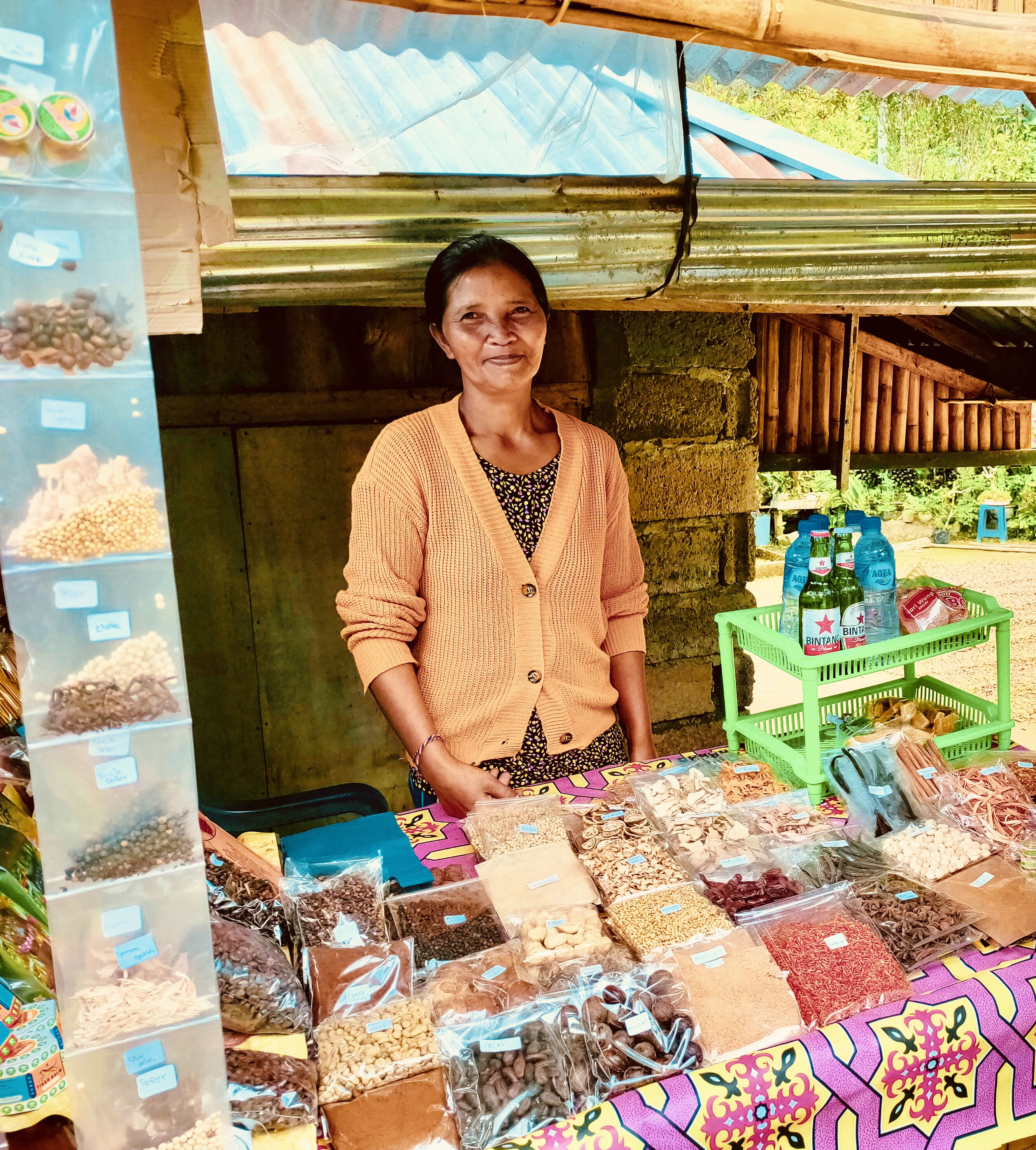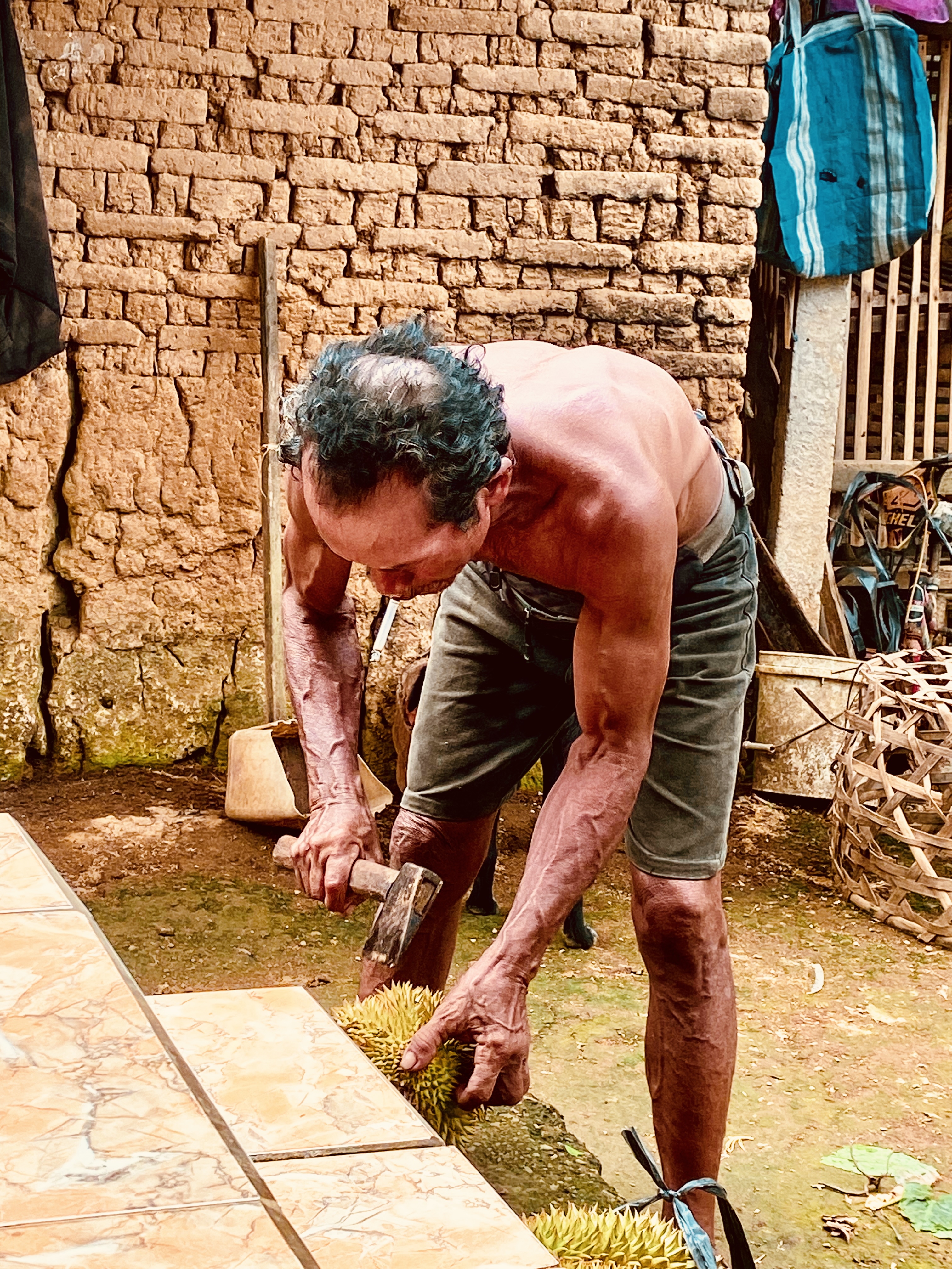 Vous voyez sur une des photos ci-dessous le papa de Nyoman qui a tenu absolument à nous faire goûter le durian, vous savez ce fruit qui sent très fort !