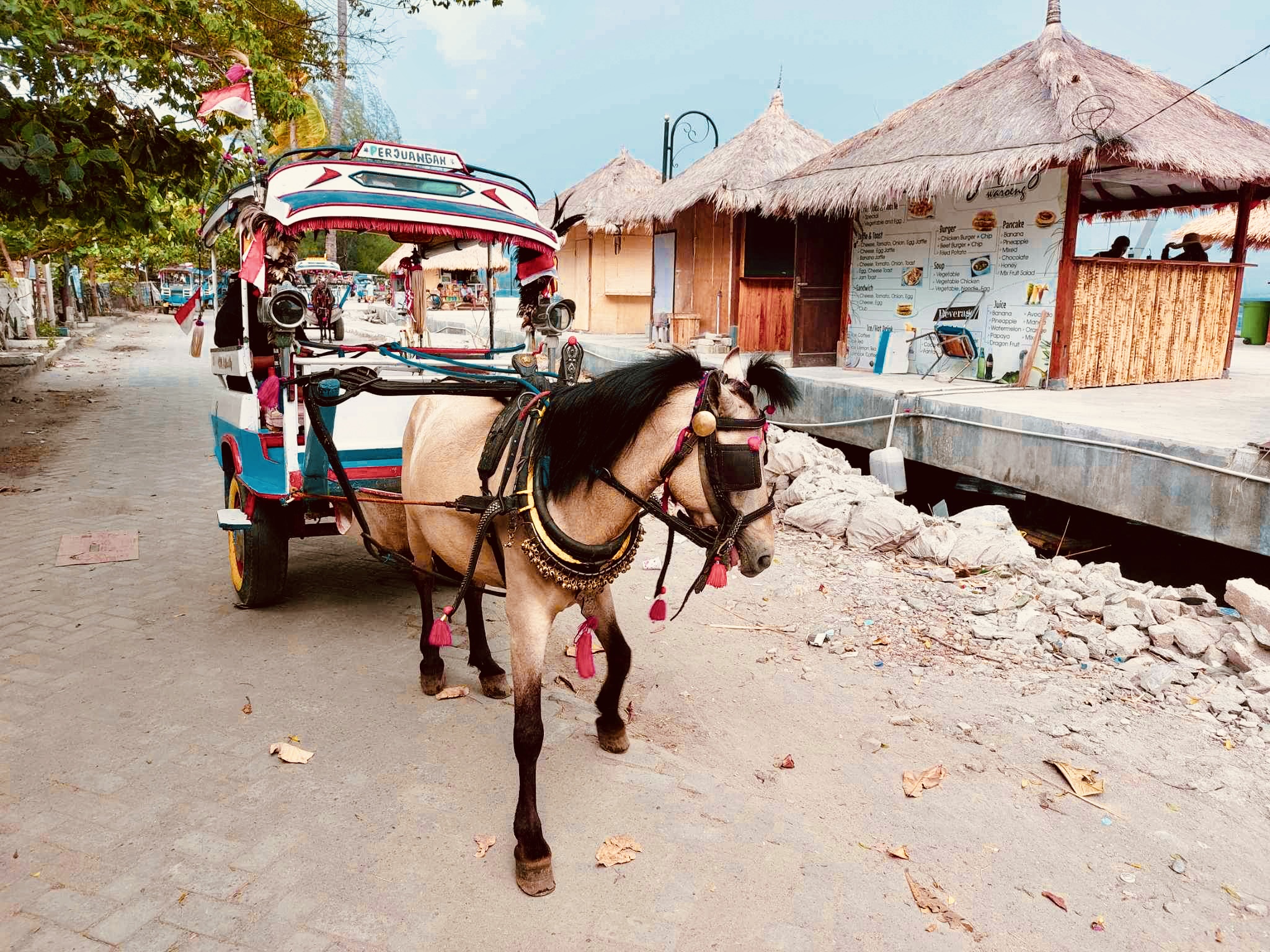 Nous arrivons à Gili Air en tout début d’après-midi, et rejoignons notre hôtel, Le Siesta Bungalows qui se trouve au Nord de l’île à environ 20 minutes à pied ou 5 minutes en carriole. Gili Air n’a aucun véhicule à moteur, étant chargés de nos bagages, et ne pouvant pas porter les sacs à dos, à cause de nos brûlures nous faisons le choix de prendre une carriole tirée par un cheval. Notre chauffeur n’est pas très causant, le cheval est bien nourri et bien traité (ce qui n’est pas forcément le cas de toutes les carrioles).