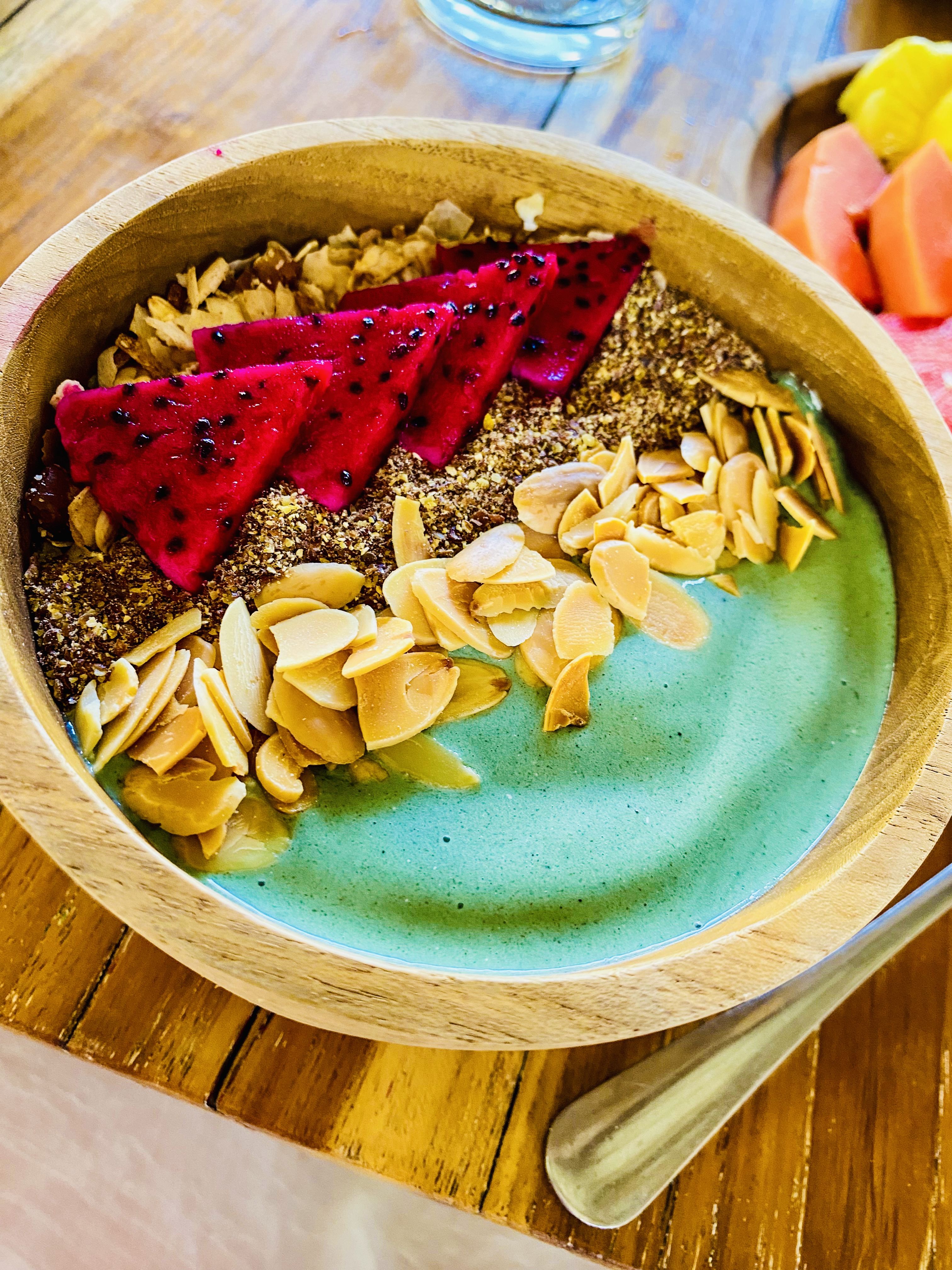 Je me fais plaisir avec des Gyozas et des Summers Rolls suivis d’une salade aux saveurs Asiatiques avec un mocktail à la mangue, Monsieur prendra du poisson cuisiné dans une feuille de bananier et une salade avec un mocktail à la fraise. Nous sommes installés dans le Jardin dans les petites cabanes en bambou typiques de Bali où l’on mange assis en tailleur sur des petites tables basses. Il y a un ventilateur et nous sommes entourés de végétation. C’est un vrai bon moment.
