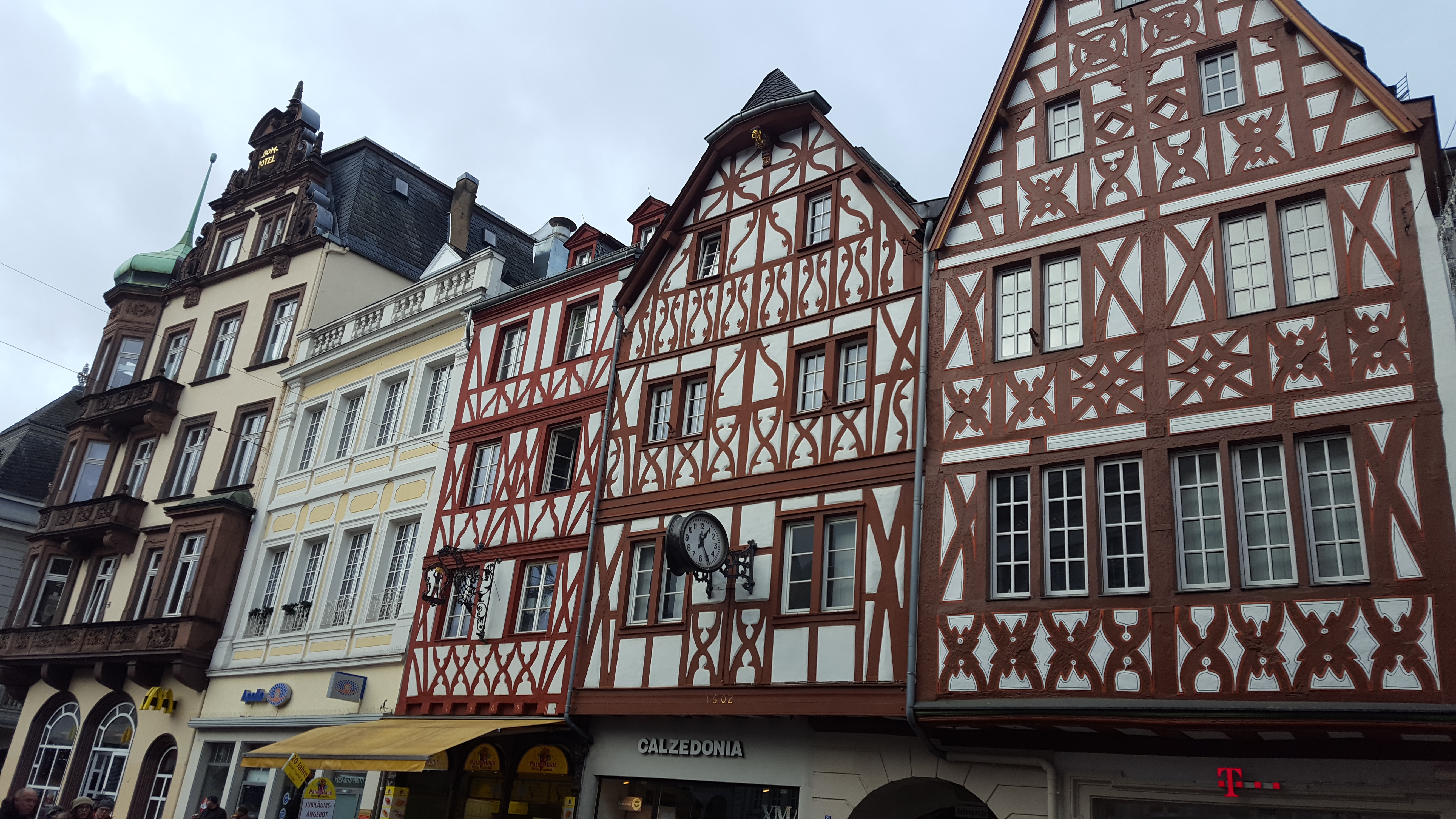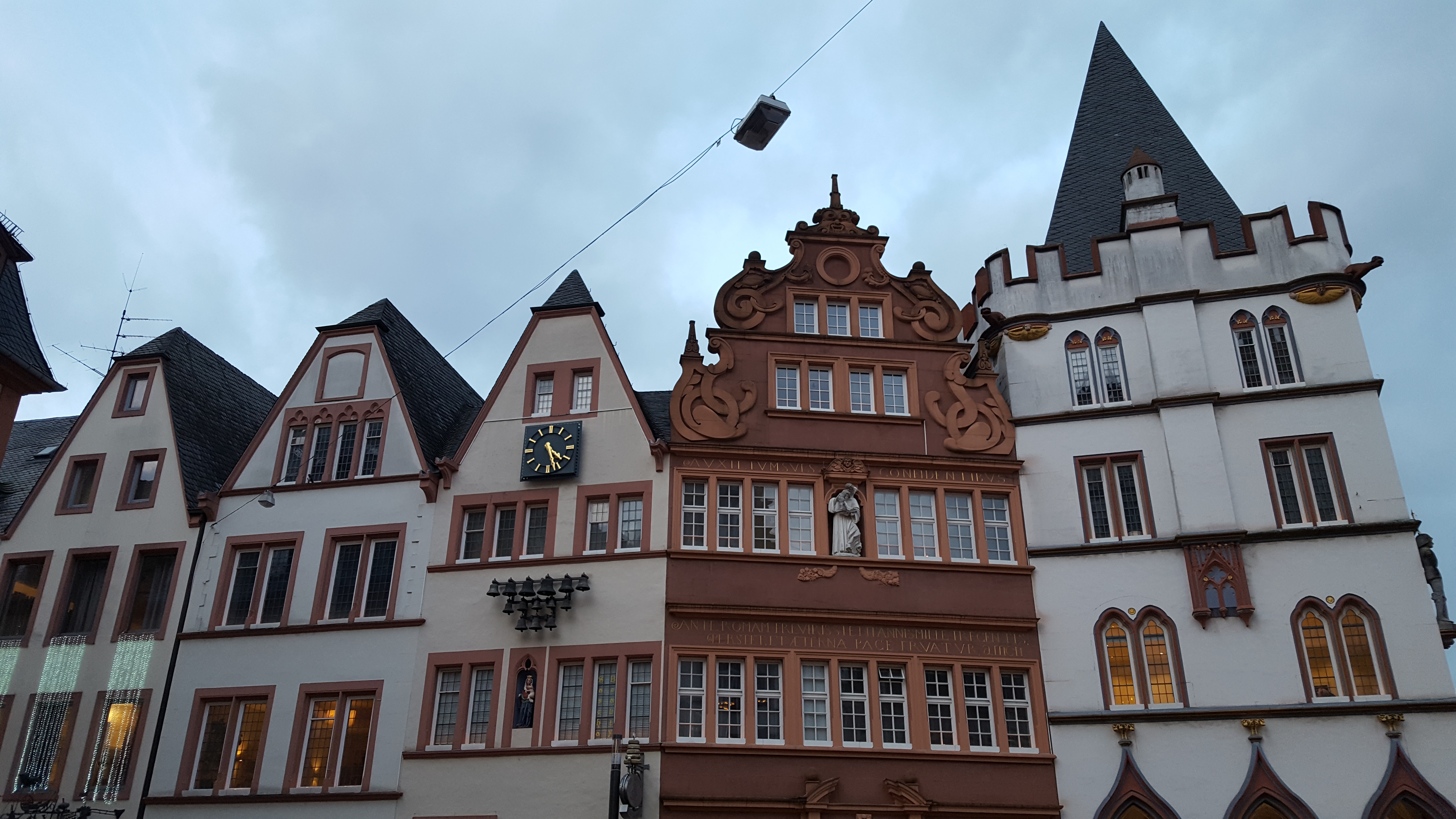 A quelques pas de là, en remontant ver la Porta Nigra, se situe la Judenpforte, l’une des portes d’entrée du quartier juif médiéval qui donne sur la Judengasse (ruelle juive). Si on ne sait pas qu’elle existe, on passe à côté sans la voir. L’entrée se trouve au milieu de la maison à colombage rouge, celle avec l’horloge, visible sur la dernière photo ci-dessous.