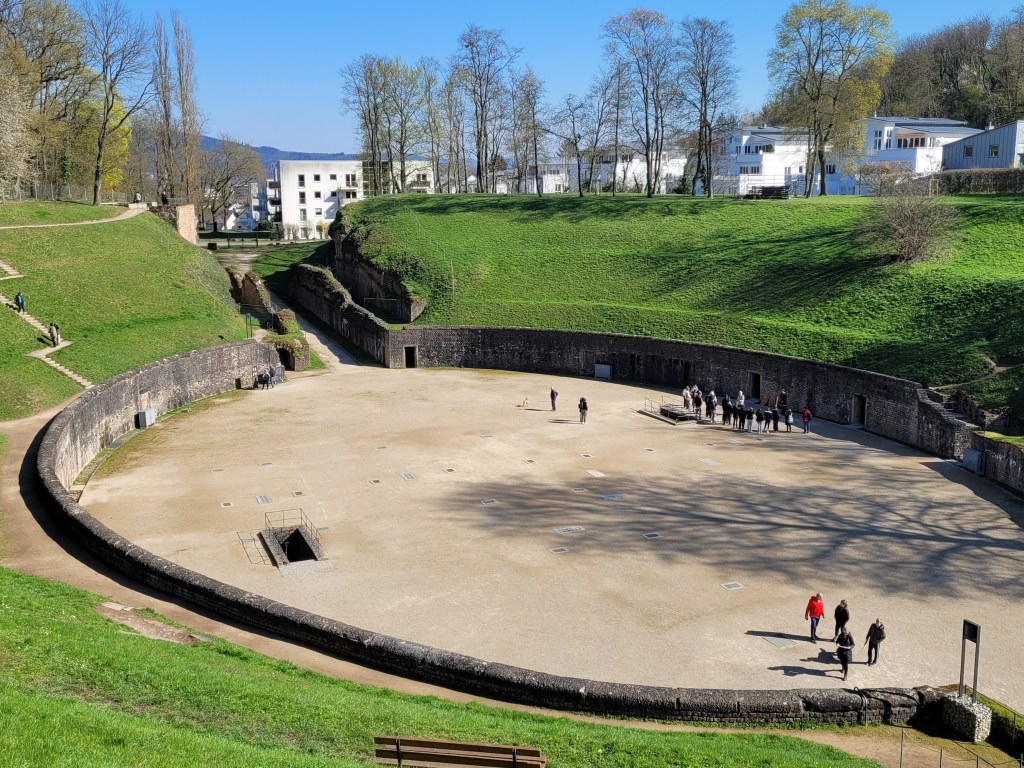 L’amphithéâtre romain, construit vers l’an 100 apr. J.C., mesurait 75 de long pour 50m de large, il comptait parmi les plus grands. Les gradins ont disparu mais l’arène et les sous-sols sont encore visibles.