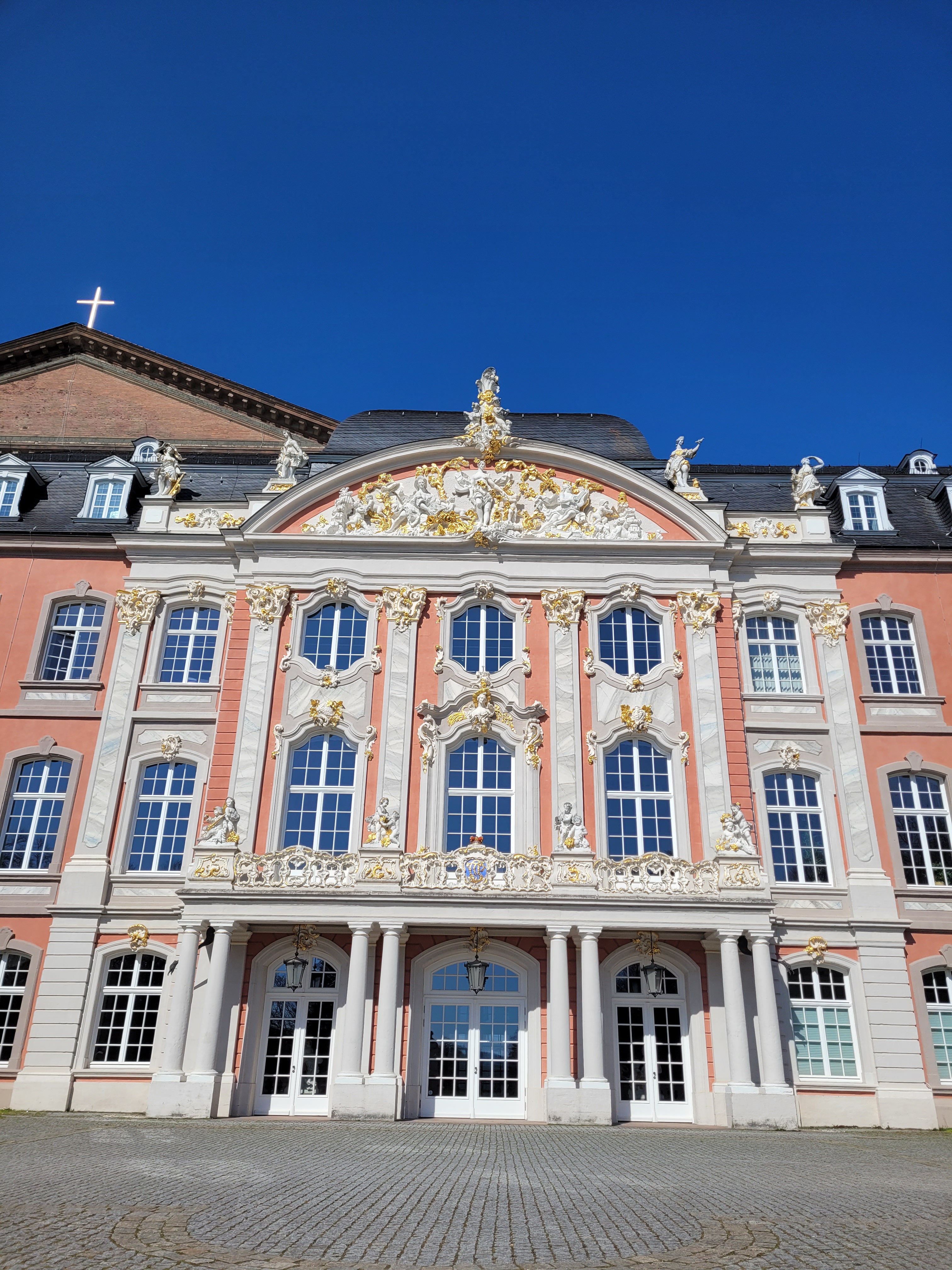Le Palais du Prince-électeur, Kurfürstliches Palais, fut construit au XVIIe s., sur les ruines d’une ancienne basilique. Jusqu’en 1794, il était la résidence des princes électeurs. Sa couleur rose et son style architectural, en partie renaissance et en partie rococo, lui confèrent un aspect féerique de palais de princesse. Sous la neige, il devient magique. Ses très jolis jardins publics sont fleuris aux beaux jours, il est très agréable d’y flâner.