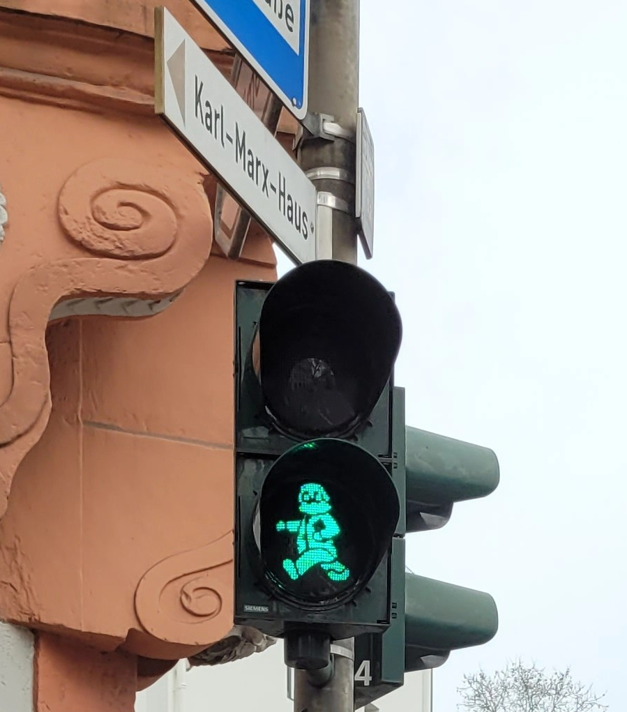 La ville lui rend hommage de différentes manières. Ainsi, on rencontre sa statue sur la Nordallee, la rue Karl-Marx-Straße porte son nom, et encore plus drôle et étonnant, des feux piétons rouges et verts sont à son effigie ainsi qu’à celle de sa femme. Pour les trouver, c’est simple, il faut bien ouvrir les yeux, mais allez, je vous aide un peu, certains se trouvent tout près de la maison Karl Marx.