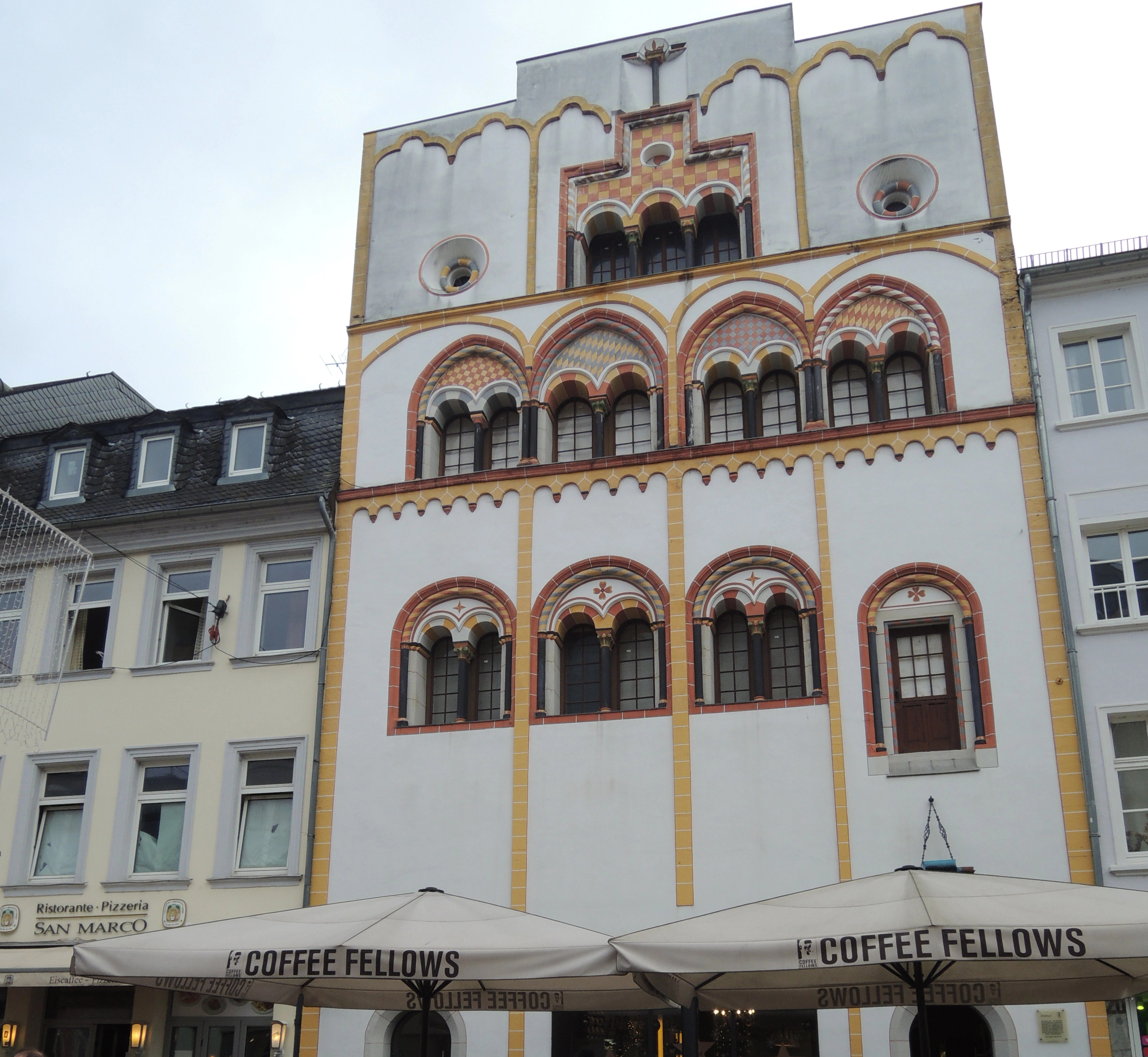 Juste à côté, au numéro 20 de la rue Simeonstraße, entre la place du marché et la Porta Nigra, se tient la Maisons des Rois Mages, la Dreikönigenhaus. Elle fut construite au Moyen-Age, entre 1200 et 1231. Cette auberge était l’une des 13 maisons-tours de la ville. Elle mélange les styles roman tardif et gothique, et est reconnaissable à sa façade blanche, ses tours de fenêtre colorés, ses arcs et ses colonnes.