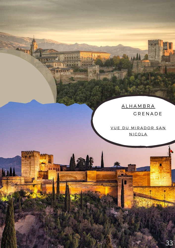 L’Alhambra et le Generalife : Un complexe palatial maure magnifique et emblématique, offrant des vues spectaculaires sur la ville et les montagnes environnantes, avec ses jardins luxuriants, ses fontaines et ses palais richement décorés.